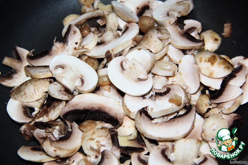 Шампиньоны помыть, порезать и выложить на сковороду.