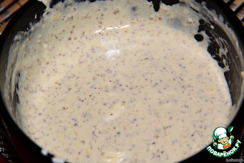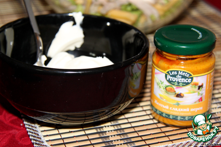 Соединим сметану, яблочный уксус, оливковое масло, дижонскую горчицу и тапенаду из желтого перца.