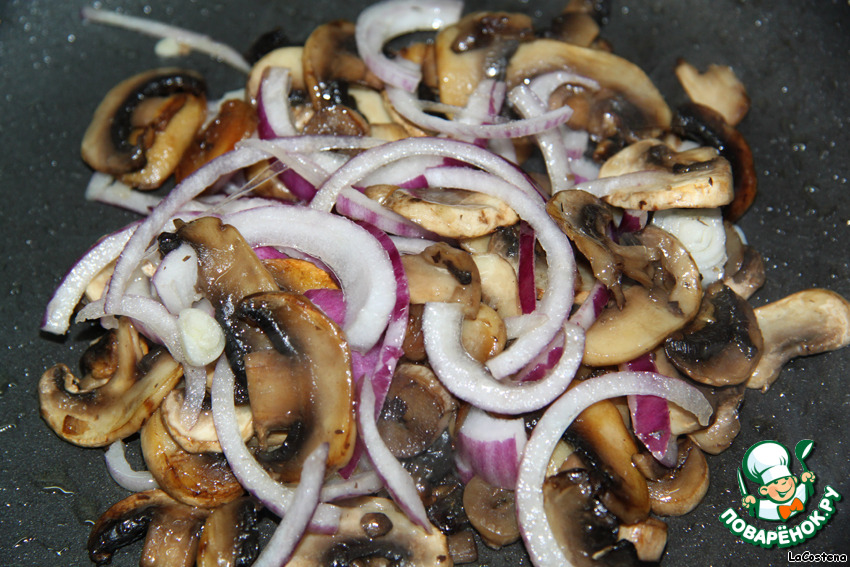 Когда шампиньоны станут золотистыми, добавим красный лук, порезанный полукольцами. Потушим 2 минуты.