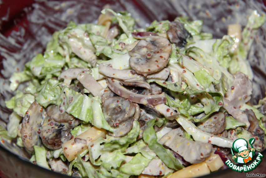 | Сытный салат из буженины, сыра и горячих шампиньонов. Заправлен оригинальным соусом. |