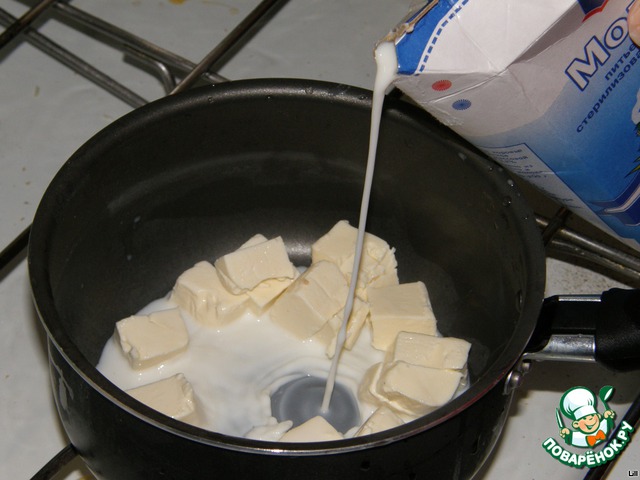 Сырок режем кубиками, забрасываем в сотейник, заливаем молоком или сливками и ставим на небольшой огонь.