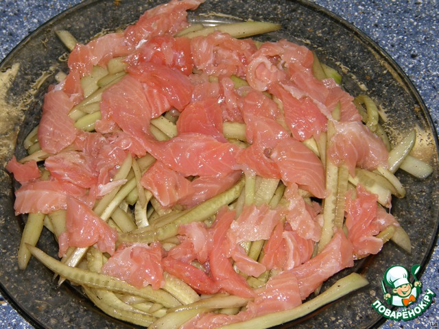 Сверху на огурчики выкладываем нарезанную ломтиками слабосолёную сёмужку.