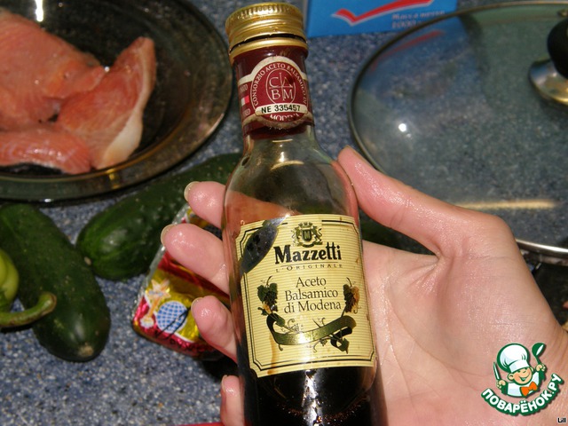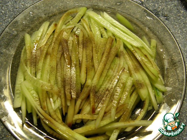 Свежий огурчик чистим от кожицы, нарезаем тонкими полосочками, складываем в тарелку, солим, перчим, поливаем бальзамиком и оставляем на несколько минут.