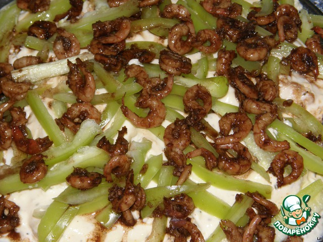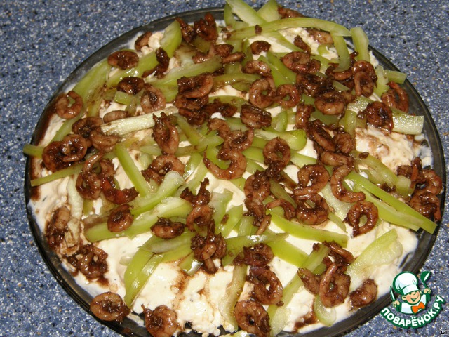 | Вкусный салатик с пикантными креветками и слабосолeной сeмужкой под нежным сырным соусом. |