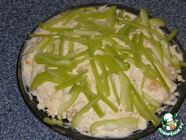 Болгарский перчик, режем тонкими полосочками и выкладываем на салат.