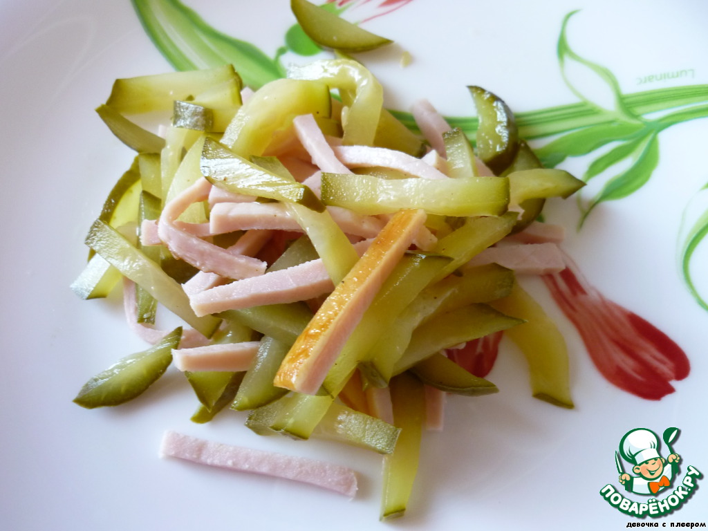 Буженину, маринованные огурцы нарезать небольшими брусочками.
