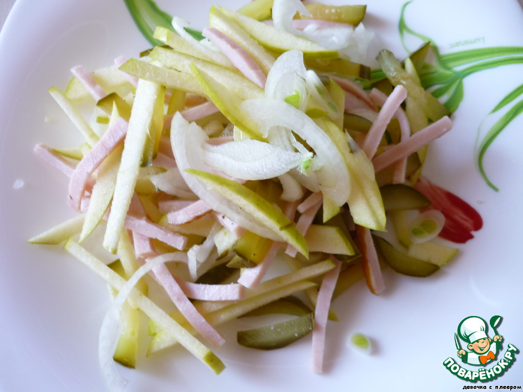 Лук нарезать тонкими полукольцами, яблоки - брусочками (как буженину).