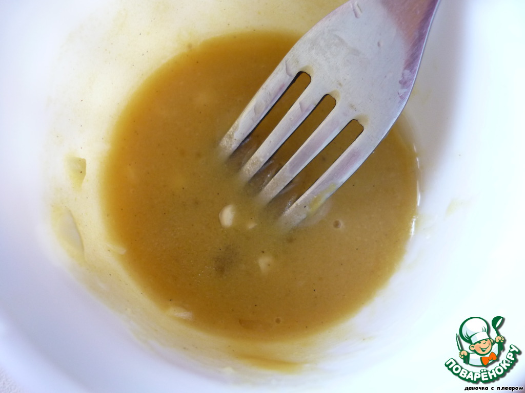 Смешать растительное масло, сок лимона, горчицу, измельченный чеснок, мед. Хорошенько взбить вилкой.