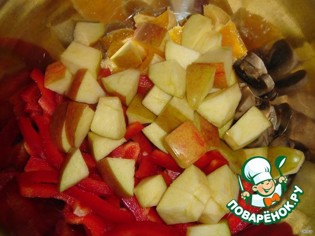 Перец порезать соломкой. Добавить апельсины и шампиньоны.