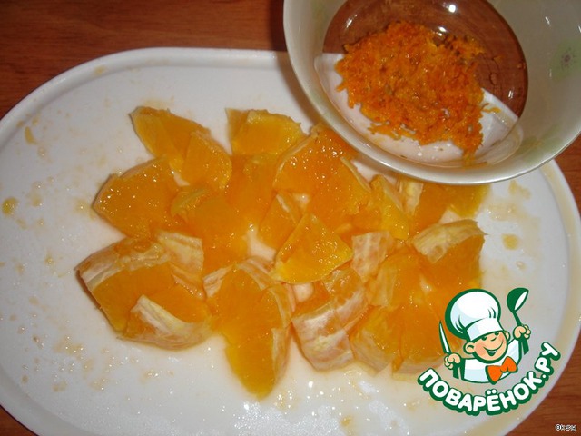 Затем очистить апельсин и нарезать мякоть кубиками.