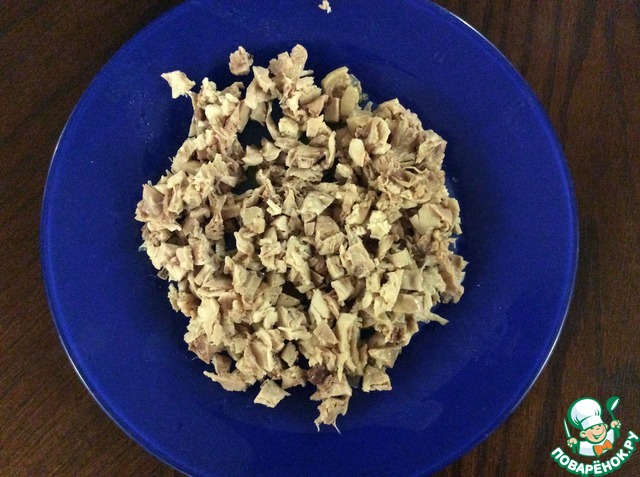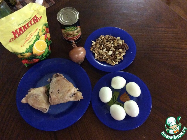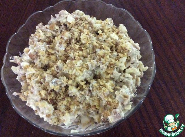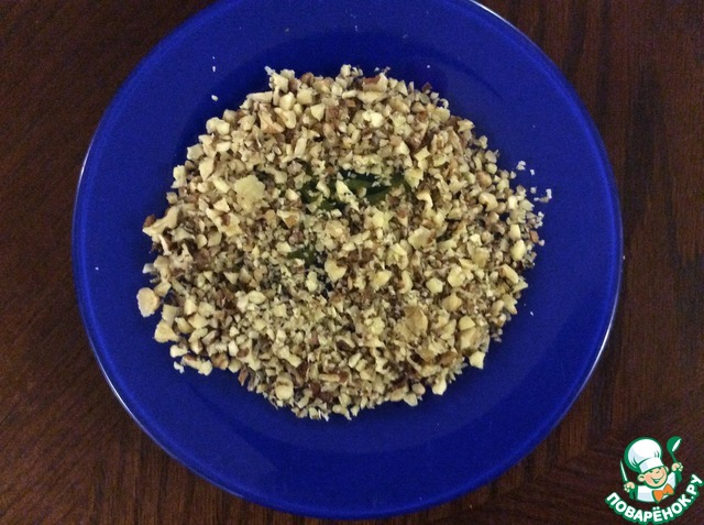 Орехи очистить, порубить мелко ножом,1/3 отложить на посыпку, остальное в салат. Можно слегка обжарить орешки, вкуснее будут.