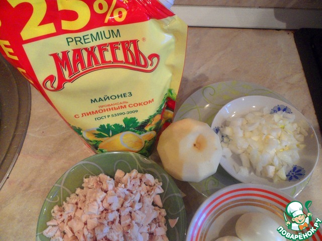 Вареную грудку нарезать кубиками, яблоко очистить и натереть на терке, лук мелко порезать, яйца отварить и натереть на терке, сыр натереть на терке.
