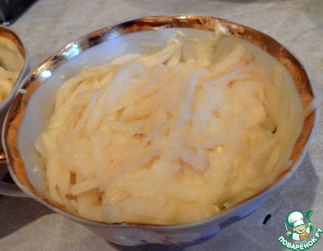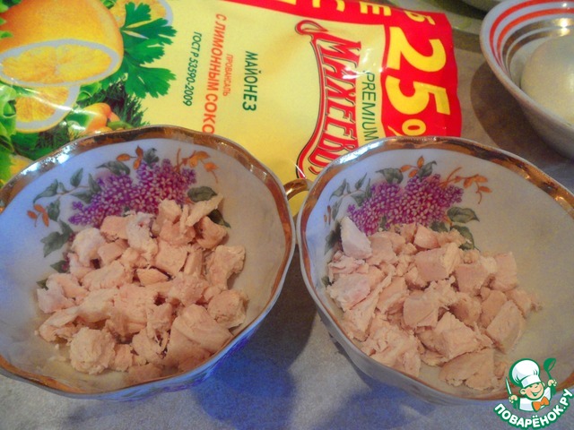 Берем порционные чашечки и выкладываем грудку, смазываем майонезом.