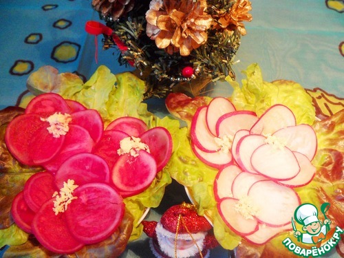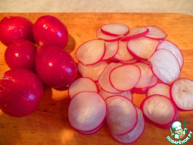Редис нарезаем тонкими слайсами, половину слайсов заливаем свекольным соком для окрашивания.