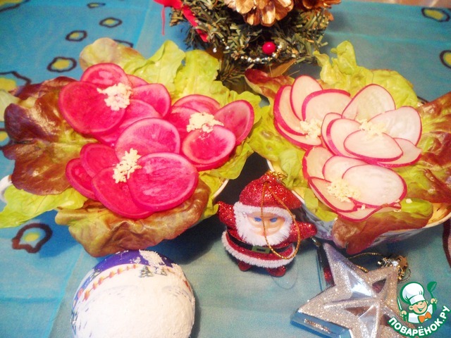 Сверху кладем листья салата и кружочки редиса в виде цветочков фиалки. 1 цветок состоит из 5 лепестков. На середину цветка кладем желток. Горшочек с фиалкой готов!
