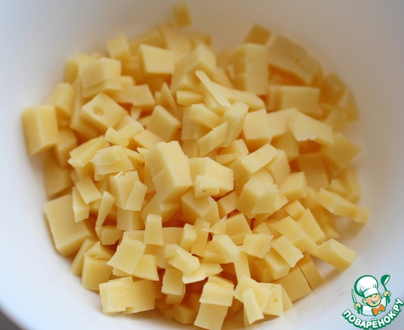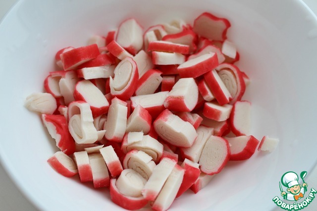 Крабовые палочки нарезать полосками толщиной 1-2 см.