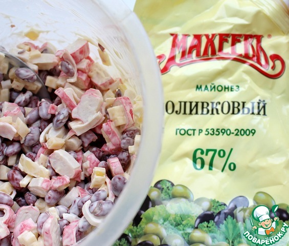 Консервированную фасоль промыть, смешать с сыром и крабовыми палочками. Добавить майонез и перемешать.