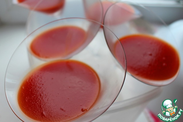 Сделать томатное желе. Для этого нагреть томатный сок до 70-80 градусов (при необходимости посолить), залить им желатин. Перемешать до полного растворения желатина, процедить и разлить по бокалам/ стаканам. Бокалы установить в холодильнике таким образом, чтобы они находились под наклоном примерно 45 градусов. Некоторые используют контейнер для яиц или пенопласт, я же использовала большой пластиковый контейнер, где у меня поместилось 5 бокалов. Оставить в холодильнике до застывания (2-3 часа).