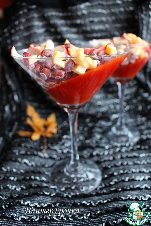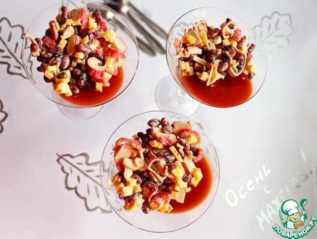 | Предлагаю Вашему вниманию не хлопотную, но очень эффектную и красивую закуску! Нежное томатное желе и аппетитный сырно-фасолевый салат в сочетании друг с другом дают непревзойденный вкус. |