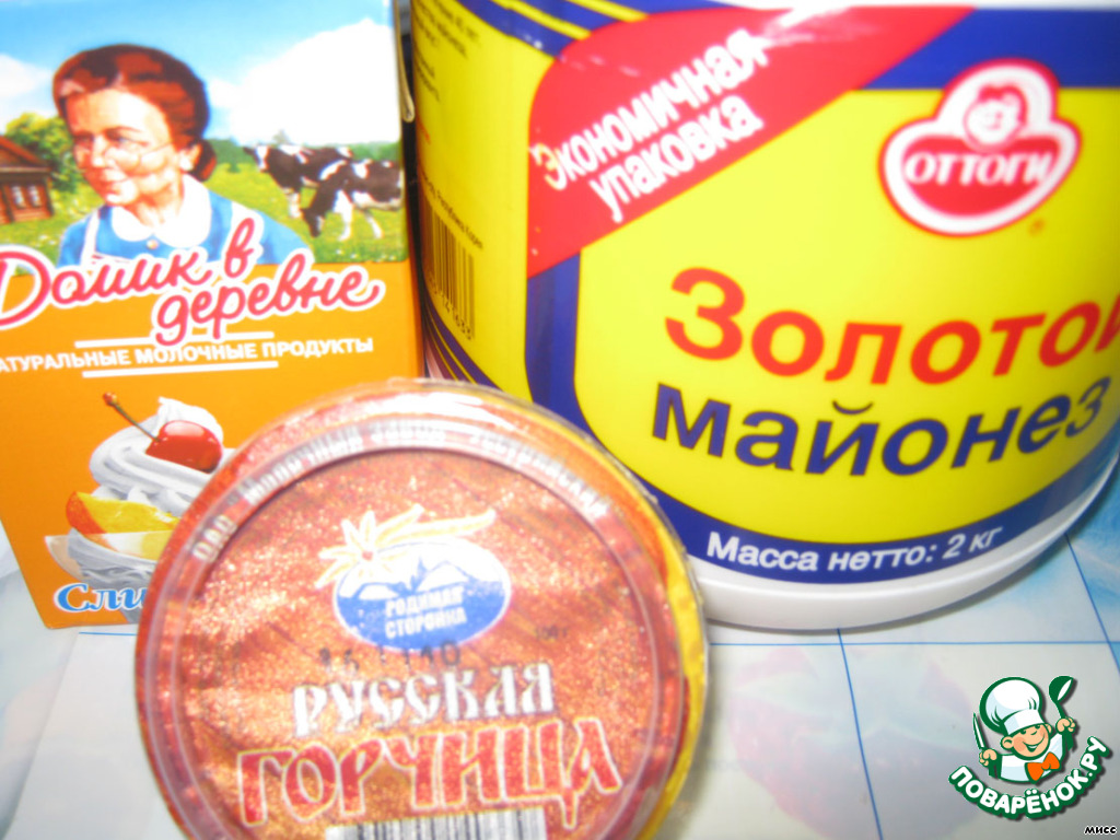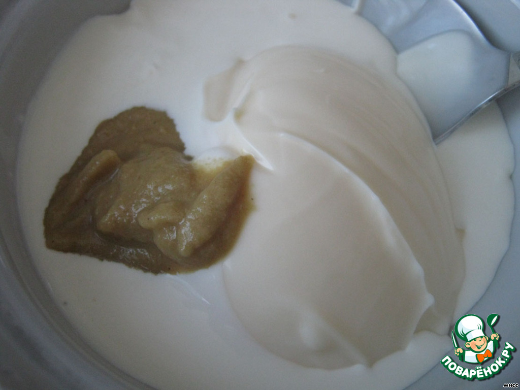 Делаем соус из майонеза, сливок и горчицы. Тщательно перемешиваем.