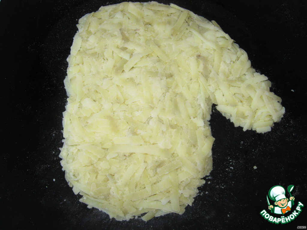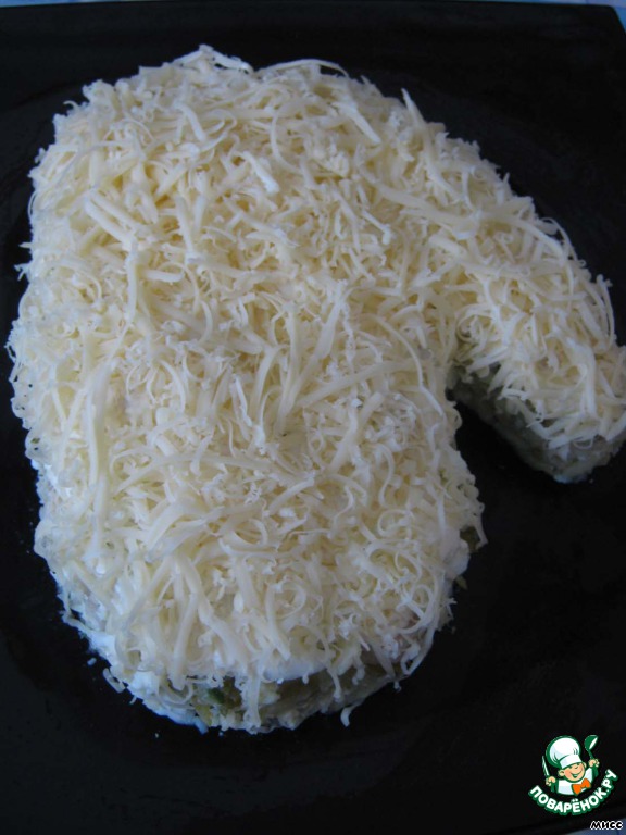 Сваренный в "мундирах" картофель очищаем, натираем на крупной тёрке и на блюде выкладываем форму "варежки".