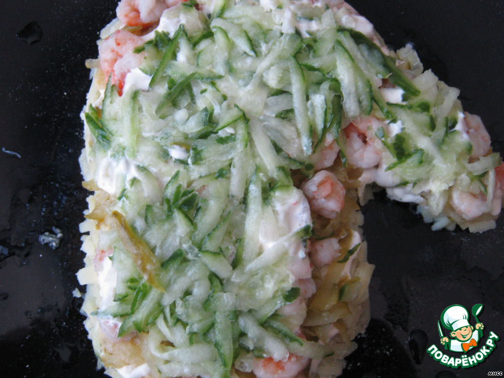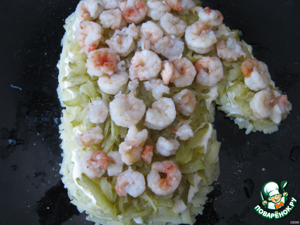 Укладываем слой креветок и опять промазываем соусом.