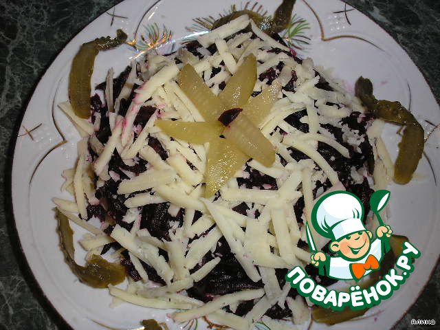 Покрываем массу второй частью свеклы, посыпаем тертым сыром и подаем к столу.