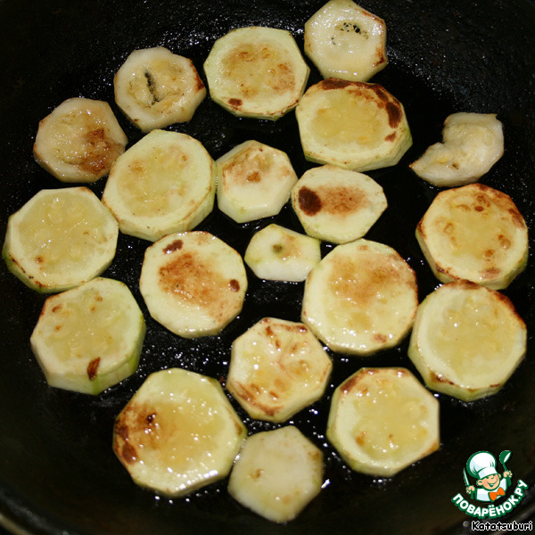 Первым делом нужно поджарить с двух сторон кабачки, предварительно очищенные и нарезанные кольцами. Отставить, чтобы остыли.
