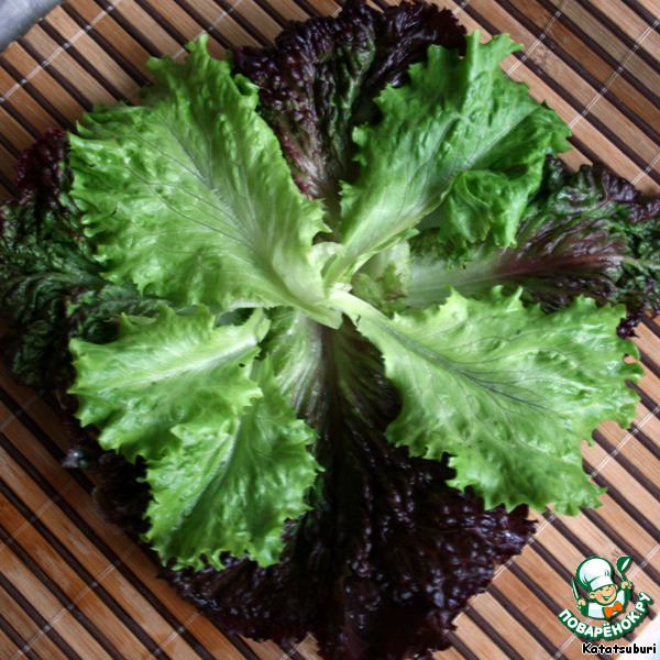 Я раскладываю сразу по тарелкам - так и подаю. Можно в вазочках - как нравится. Первым делом из цельных листьев делаю вот такой цветок, оставшийся салат рву на кусочки и раскладываю сверху.
