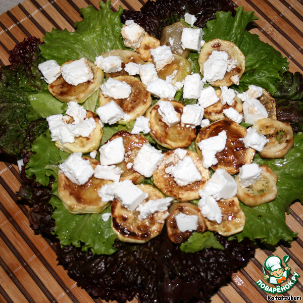 Далее на салатную подушку выкладываем в один слой остывшие кабачки. Слой необходимо немного сбрызнуть соевым соусом.
