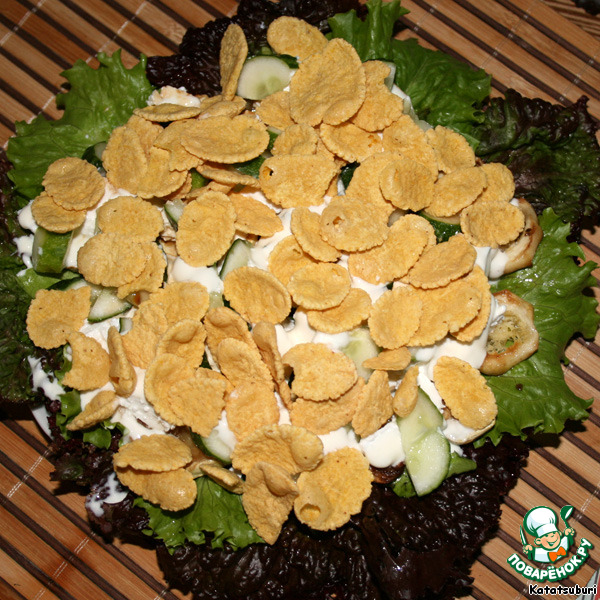 Присыпаем щедрой рукой несладкими и неглазурованными кукурузными хлопьями. У меня корн-флекс "Start"