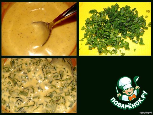 сливки, уксус, оливковое масло, горчицу, соль и молотый черный перец взбить до однородной массы.