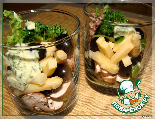 Смешать листья салата, нарезанные пластиками шампиньоны, оливки, спаржу и нарезанный тонкими палочками сыр. Сбрызнуть лимонным соком.