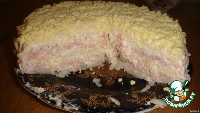 Слоенный салат с колбасой