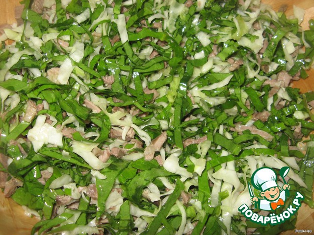 | Мягкое, сочное мясо, в сочетании с щавелем, капусткой, маринованным лучком и орешками. В итоге-необыкновенно вкусный салат!!! |