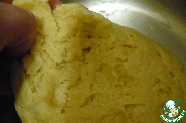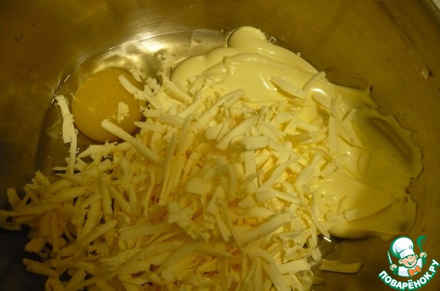Смешать сначала яйца, майонез и мягкий маргарин. Если у Вас маргарин, как у меня, замороженный, то натрите и оставьте на несколько минут на столе. Затем вмешать муку и замесить тесто.