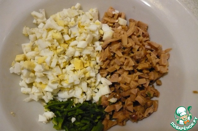 Яйца, печень и лук измельчить, перемешать с майонезом.