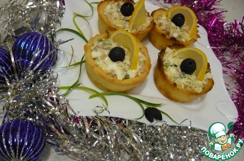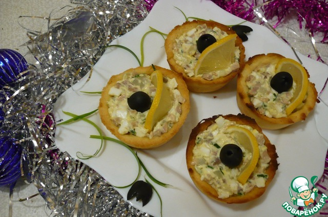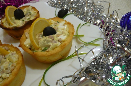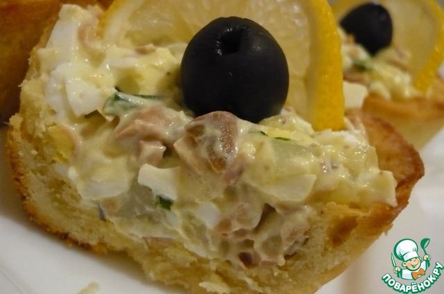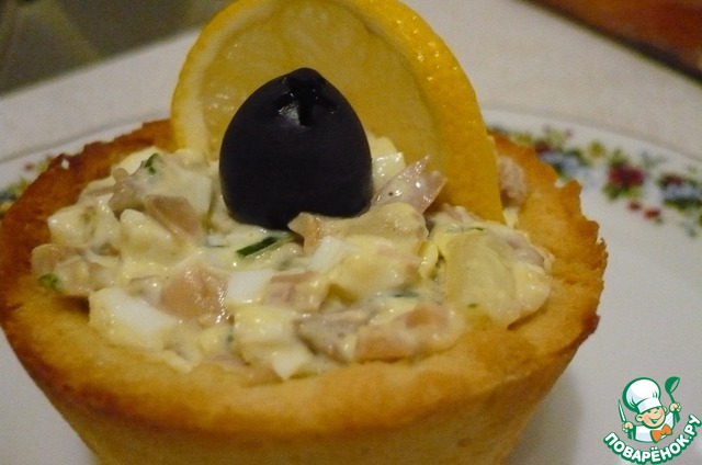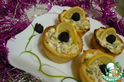 Теперь украшаем. В серединку вставляем маслину и половинку лимона.