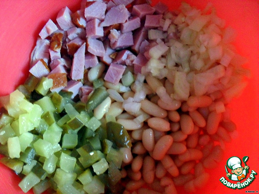 Окорок, огурец и лук нарезать кубиками, добавить к фасоли.