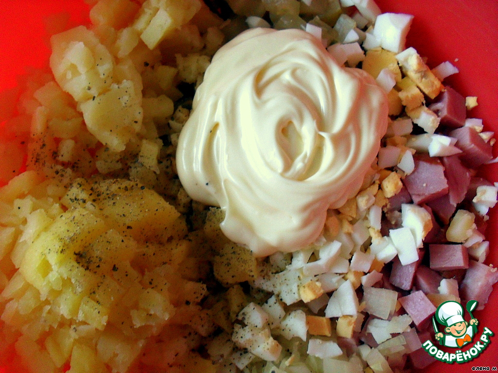 Картофель и яйца также нарезать кубиками, добавить к остальным ингредиентам.