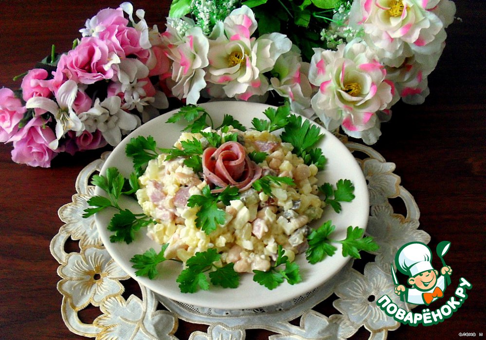 Украсить зеленью петрушки, можно сделать розочку из кусочка окорока.