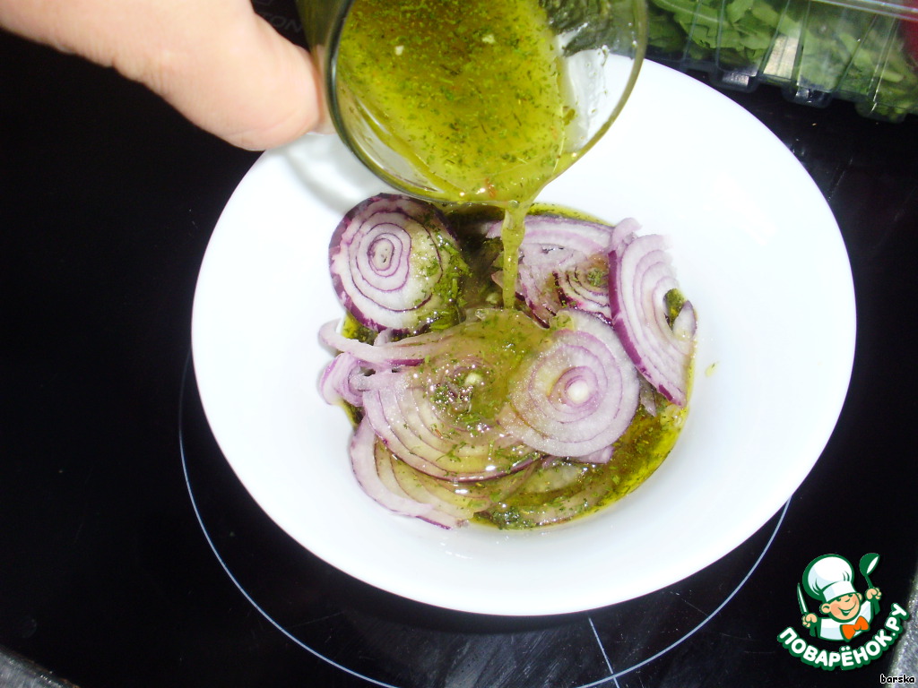 Сделать заправку: смешать 2 пакетика заправки (у меня были 2 разные: с "ноткой укропа" и "с лимонной ноткой", а в идеале - "греческий вариант") от "Кнорр" с 6 столовыми ложками воды и 4-6 столовыми ложками оливкового масла. Залить заправкой лук, оставить мариноваться на 15 минут.