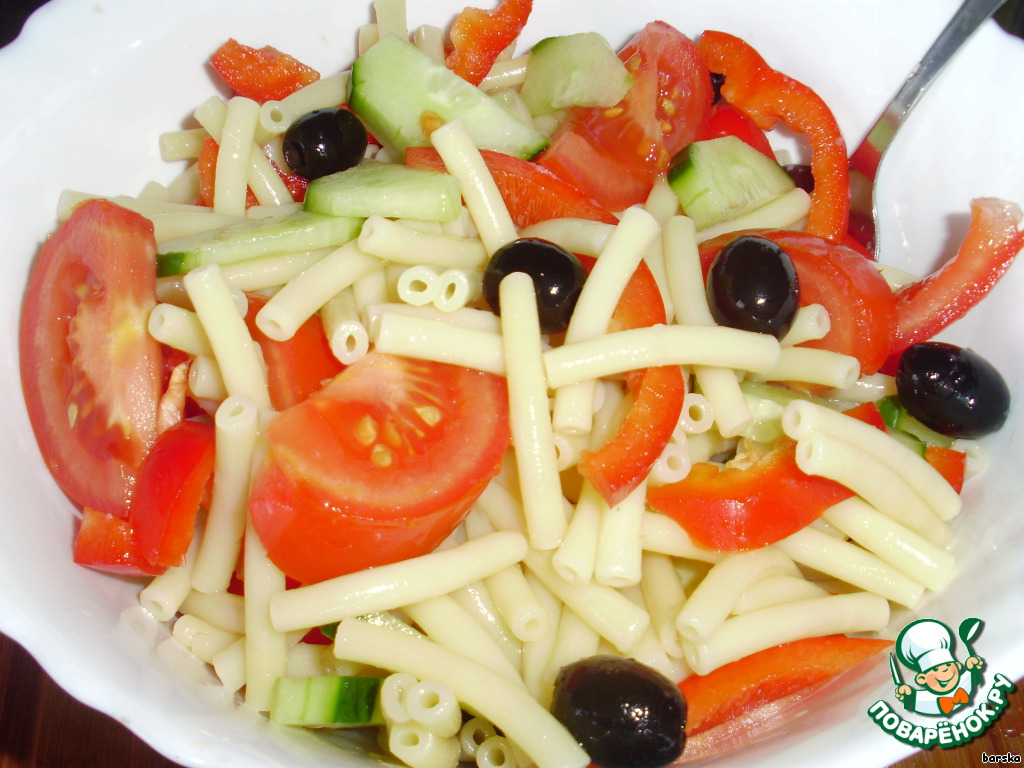 Смешать готовые макароны, паприку, помидоры, огурец и оливки.