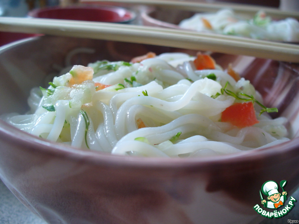 | Вот такой салат у нас прижился в качестве закуски, когда к нам приходят гости "на суши". Т. е. суши и роллы само собой, на горячее делаю шашлычки из курицы типа якитори + вот этот салатик из рисовой или стеклянной лапши. Рецепт очень простой, но закуска получается очень вкусная! Особенно мне нравится со стеклянной лапшой. Лапша - основной ингредиент, остальные - в принципе, по вкусу, но их немного, для легкого оттенка вкуса, остроты и внешнего вида. Так что, это, скорее идея, которую можно подогнать под свои пристрастия и вкус. |