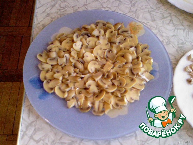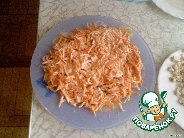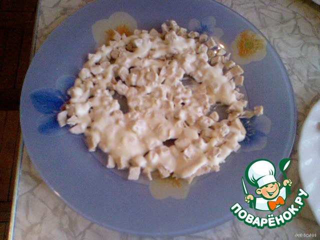 1 слой - половина нарезанного филе с майонезом (я смешиваю - так легче выравнивать по тарелке).