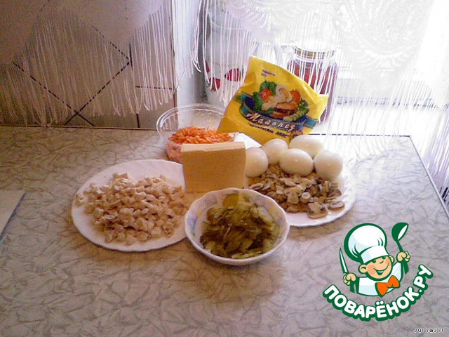 | Этот салат уже делаю давно. Рецептом со мной поделилась моя кумася. Делаю его довольно часто - почти на каждый званый ужин. Особенно должен понравиться женщинам! В этот раз я делала его из собственноручно приготовленных маринованных грибочков по рецепту из Поварeнка. |