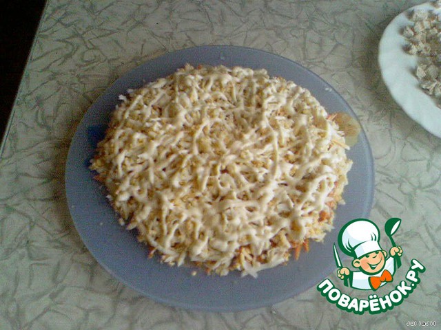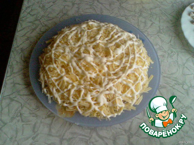 5 слой - тёртый сыр и немного смазываем майонезом.