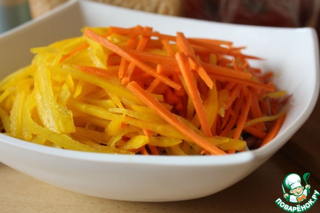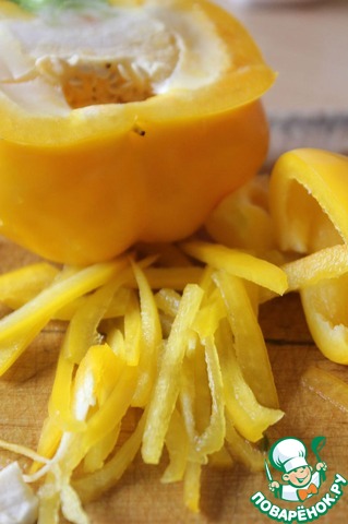 Соломкой нарезать и болгарский перец, у меня были красный и желтый небольшого размера.