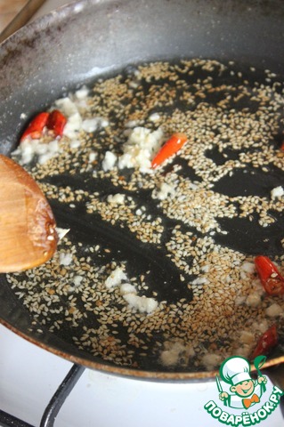 Теперь обжарить на оливковом масле пропущенный через чеснокодавилку чеснок, крупно порезанный перец чили и кунжут. Кунжут должен стать золотистого цвета. Мне хватило одного перца чили, было довольно остро, вы же можете использовать больше перца или меньше, дело вкуса. Как только кунжут подзолотится, уберите чили, а чеснок с кунжутом и маслом отправьте в блюдо с овощами и свиными ушами.
