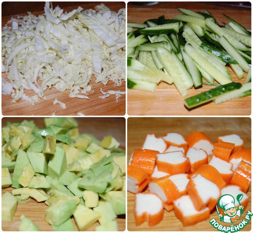 авокадо, крабовые палочки и рыбу нарезать кубиками.